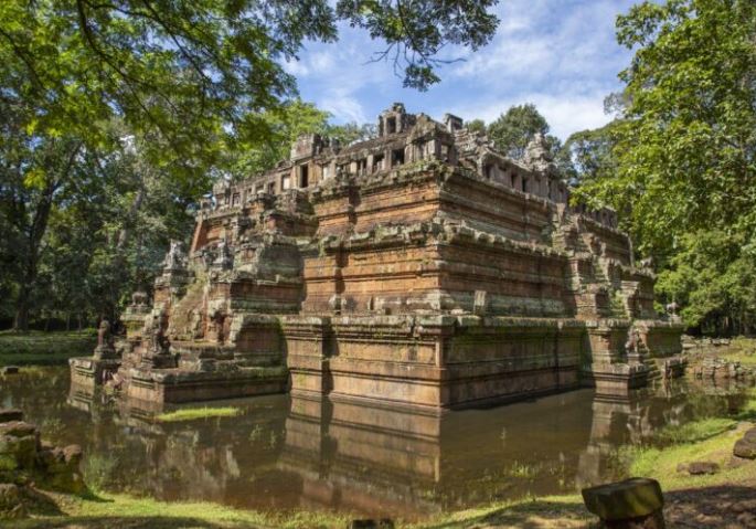 Neak Pean: It’s originally built for medical purposes and the unique design with four pools and each represent Water, Earth, Fire and Wind, connected to the central main pool water source, the Mahayana Buddhist temple was stood on the circuit artificial island, and adorn by sculptures of snakes (Nāga) running around the base of the temple structure
